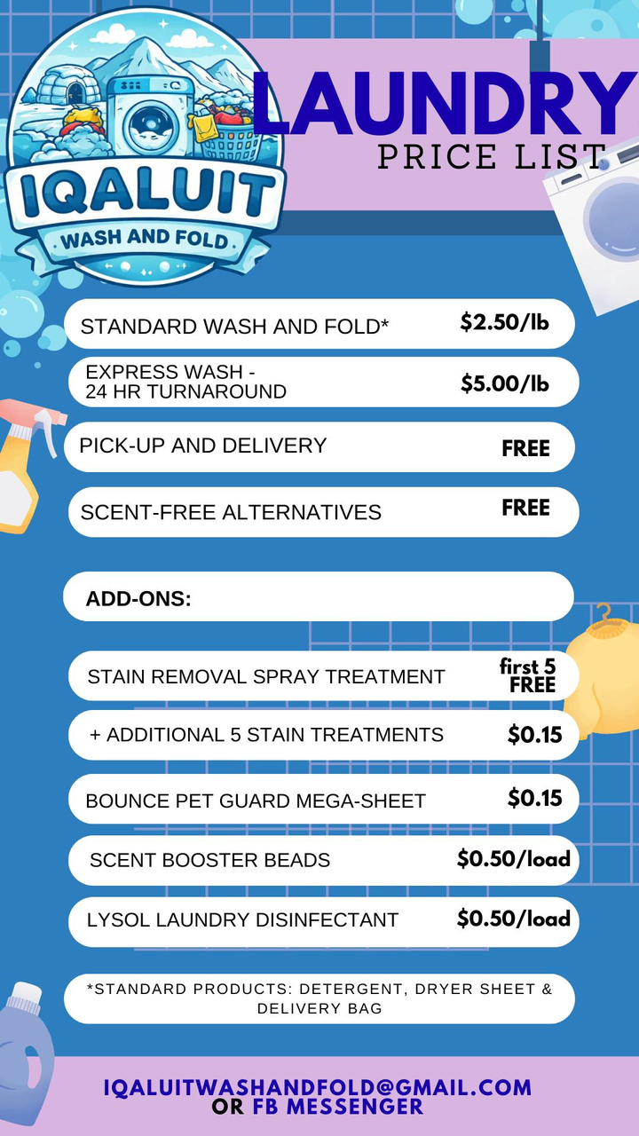 Your time is priceless. Let us do your laundry. Folded and Delivered. Enjoy Iqaluit's only service at great prices.